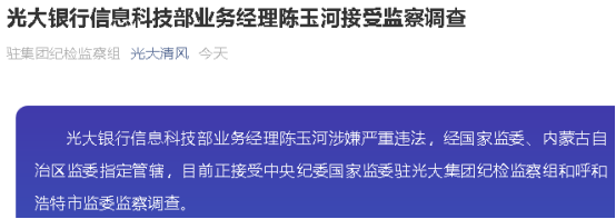 继光大银行南宁分行党委书记、行长周江涛接受审查调查于7月21日被官宣接受审查调查,7月22日,光大银行信息科技部业务经理陈玉河也被宣布接受监察调查。