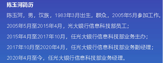 履历显示,周江涛出生于1977年5月,2004年2月参加工作后便一直在光大银行系统工作,先后在该行西安分行、拉萨分行、南京分行等分支机构任职。陈玉河出生于1983年3月,2005年5月参加工作后也一直在光大银行系统工作。今年4月,陈玉河任光大银行信息科技部业务经理。