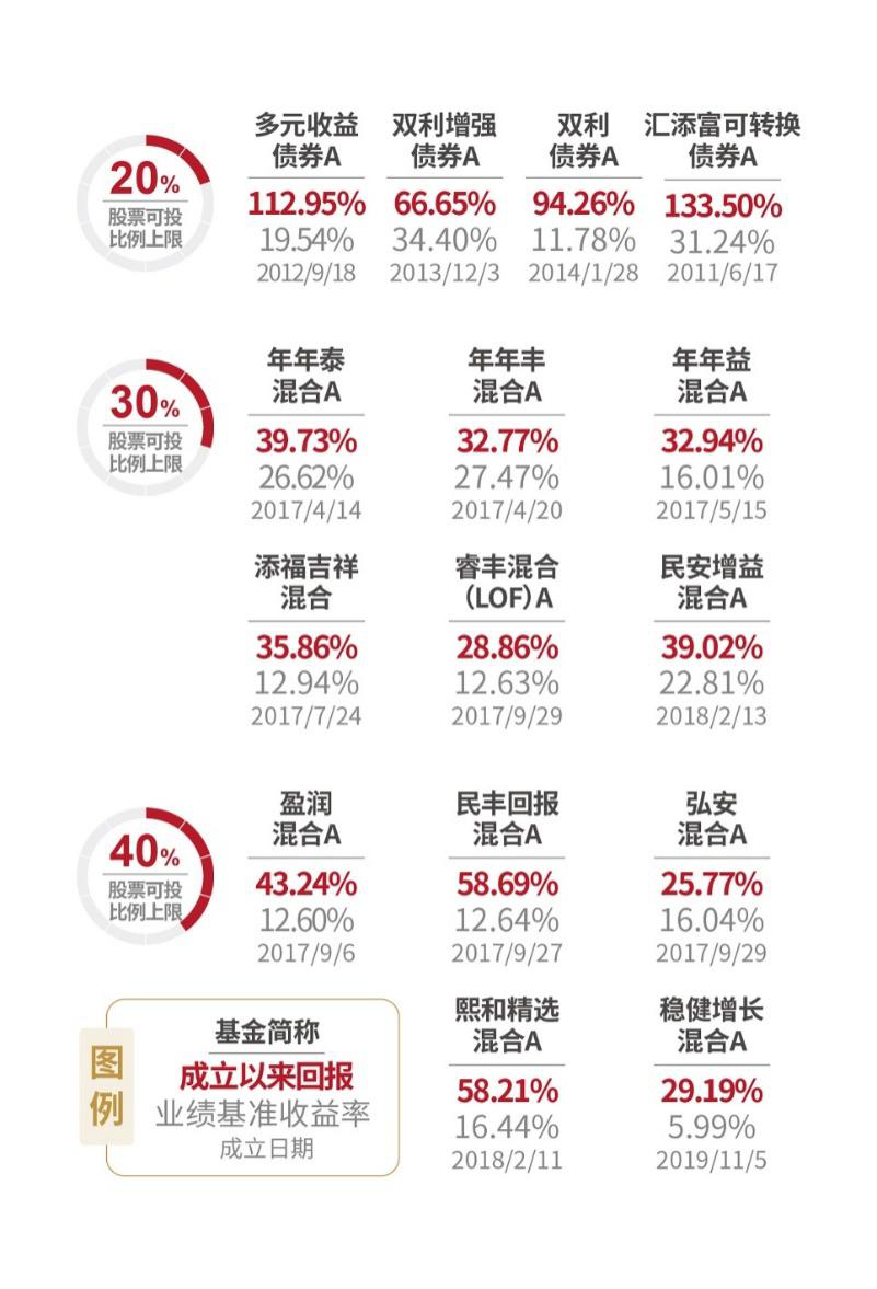 凭借突出的主动选股优势,汇添富基金在“固收+”领域树立了自己良好的口碑,并收获了累累硕果。自汇添富开始精耕“固收+”产品起的8年多来,不管是股票投资上限20%、30%还是40%,汇添富都有业绩亮眼的代表产品: