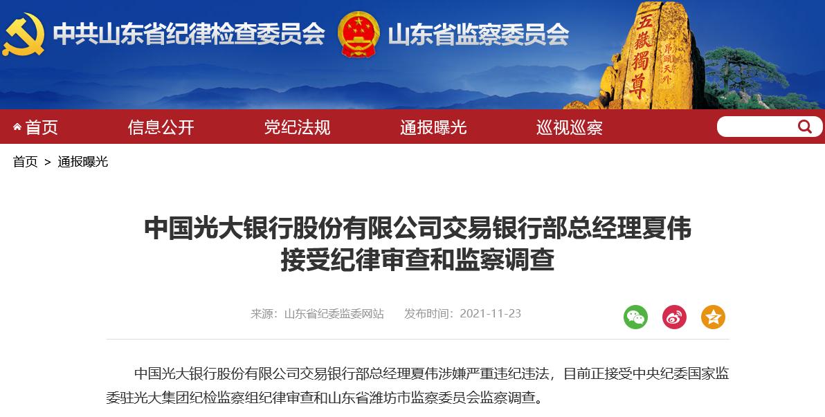 11月23日,据山东省纪委监委网站,光大银行(601818,)交易银行部总经理夏伟涉嫌严重违纪违法,目前正接受中央纪委国家监委驻光大集团纪检监察组纪律审查和山东省潍坊市监察委员会监察调查。