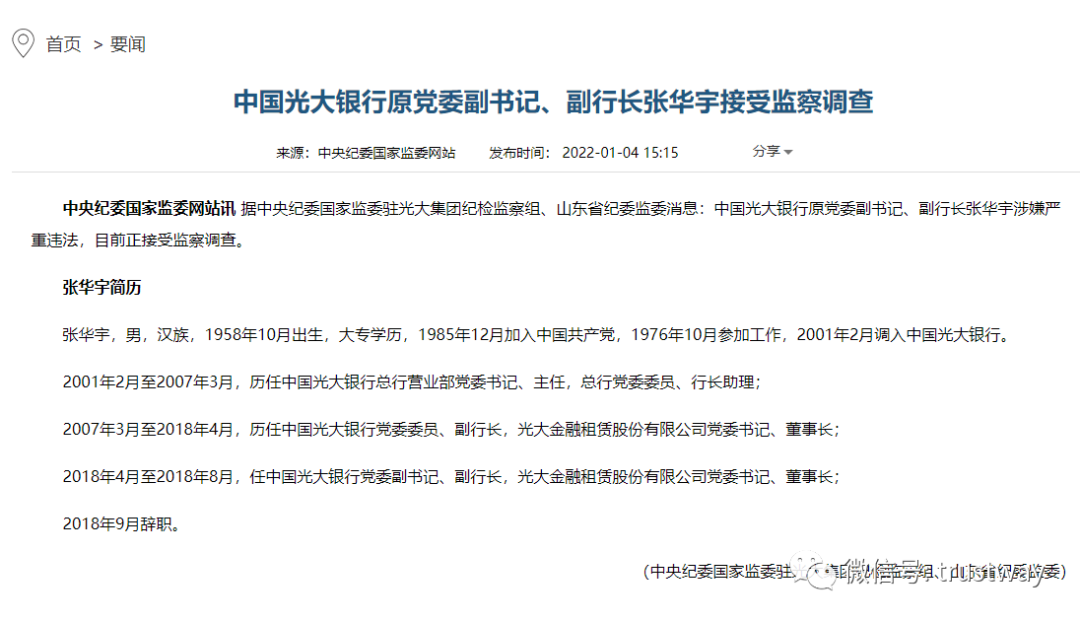 1月4日,根据中央纪委国家监委驻光大集团纪检监察组、山东省纪委监委最新消息——中国光大银行原党委副书记、副行长张华宇涉嫌严重违法,目前正接受监察调查。
