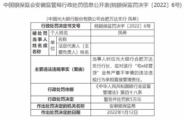 凤希时任光大银行合肥万达支行行长,应对该行“宅e经营贷”业务严重不审慎的违法违规行为承担直接管理责任。