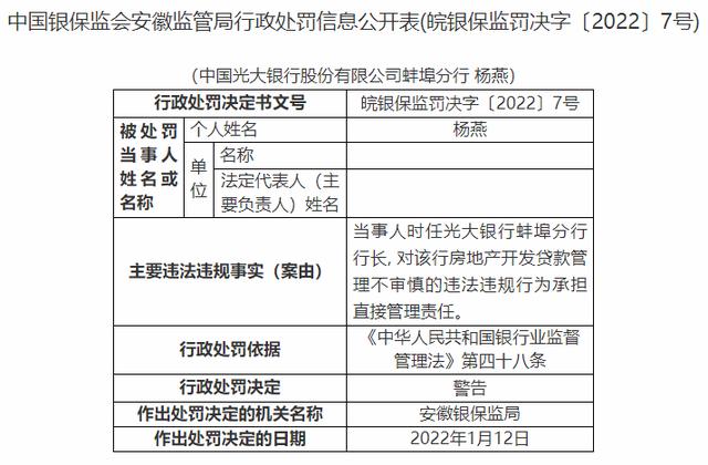杨燕时任光大银行蚌埠分行行长,对该行房地产开发贷款管理不审慎的违法违规行为承担直接管理责任。