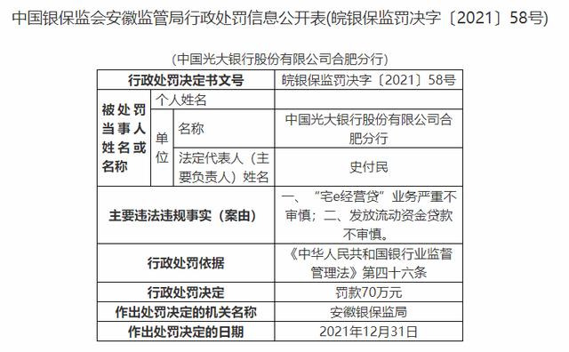 其中,合肥分行因“宅e经营贷”业务严重不审慎和发放流动资金贷款不审慎被罚70万元;合肥万达支行因“宅e经营贷”业务严重不审慎被罚款50万元;蚌埠分行因房地产开发贷款管理不审慎被罚款30万元。