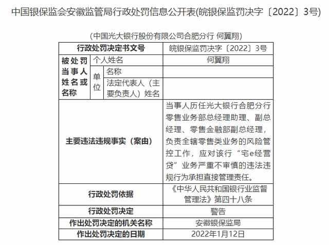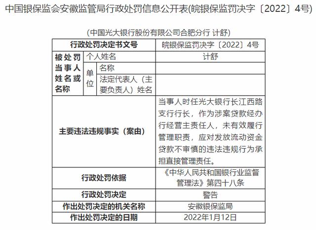 值得一提的是,1月21日被罚人员牛娟、凤希、杨燕分别任职光大银行合肥分行、合肥万达支行、蚌埠分行。