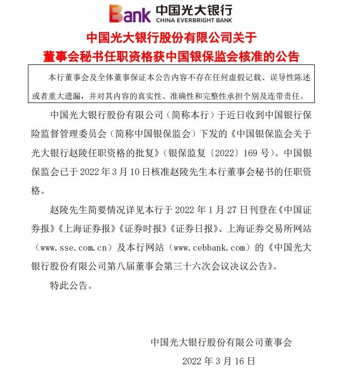 今日,中国光大银行发布公告称,于近日收到中国银行保险监督管理委员会(简称中国银保监会)下发的《中国银保监会关于光大银行赵陵任职资格的批复》(银保监复〔2022〕169号)。中国银保监会已于2022年3月10日核准赵陵中国光大银行董事会秘书的任职资格。