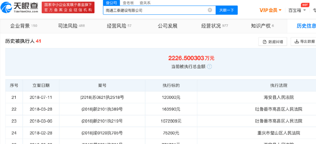 有趣的是,根据历史被执行信息显示,早在2018年申请担保的南通工泰就已经被列为失信被执行人。光大银行南通分行为何会为一家被执行得“老赖”开具保函?这里面的原因可能就不得而知了。