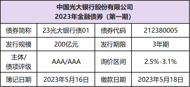 中国光大银行股份有限公司2023年金融债券(第一期)将于5月16日在全国银行间债券市场簿记发行。本期债券发行期限为3年期,发行规模为200亿元。本期债券发行的主体评级为AAA,债项评级为AAA。本期债券发行的募集资金将用于优化发行人负债结构,充实营运资金,促进业务稳健发展。诚邀投资人认购询价!