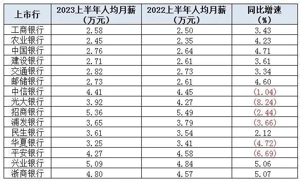 据Wind数据显示,国有大行中,上半年人均月薪最高的是交通银行,为2.82万元,其次是中国银行、邮储银行、建设银行、工商银行、农业银行。其中,同比涨幅最高的是中国银行,同比增长4.71%;农业银行上半年人均月薪垫底,为2.45万元。