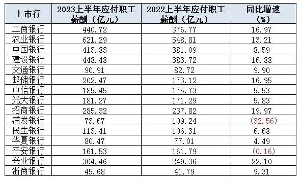 从上述15家银行披露的总体薪酬情况看,多数上市行上半年员工总体薪酬水平稳定,应付职工薪酬同比均有所上涨。