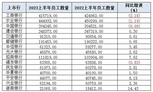 在国有六大行及9家A股上市股份行中,大部分上市行上半年员工数量实现上涨,工商银行、农业银行、中国银行、浦发银行则出现减员情况。