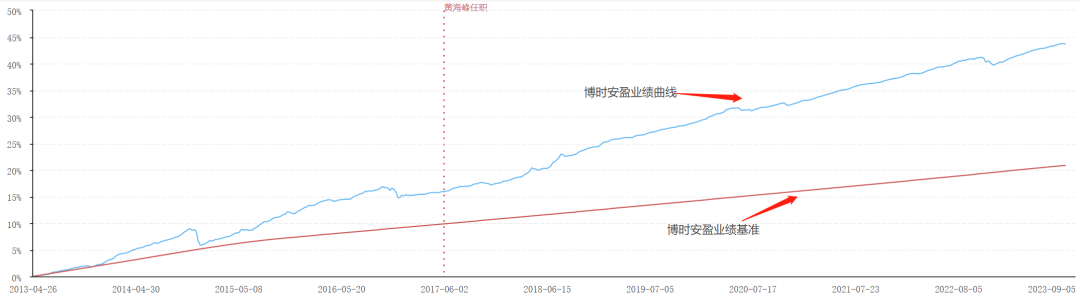 整体来看,黄海峰在博时安盈上的任职年化回报做到了3.60%,而同期业绩基准年化为1.57%。黄海峰给出的年化回报远超越业绩基准,这在固收基金经理中,是难能可贵的。
