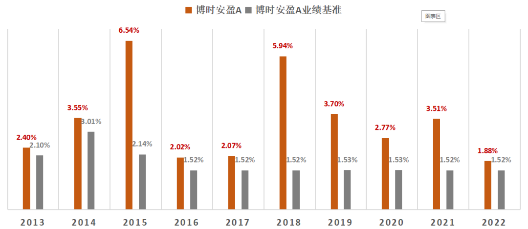 具体来看博时安盈过往10个会计年度的收益率和当年业绩基准的对比情况,可以看到它在追求绝对收益的同时,过往会计年度也跑赢了业绩基准: