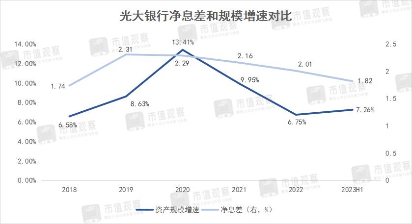 数据显示,自2019-2023年上半年,光大银行净息差从2.31%一路下降到1.82%,同期资产规模增速自2020年达到13.41%后便不断下降,到2023年上半年仅7.26%。