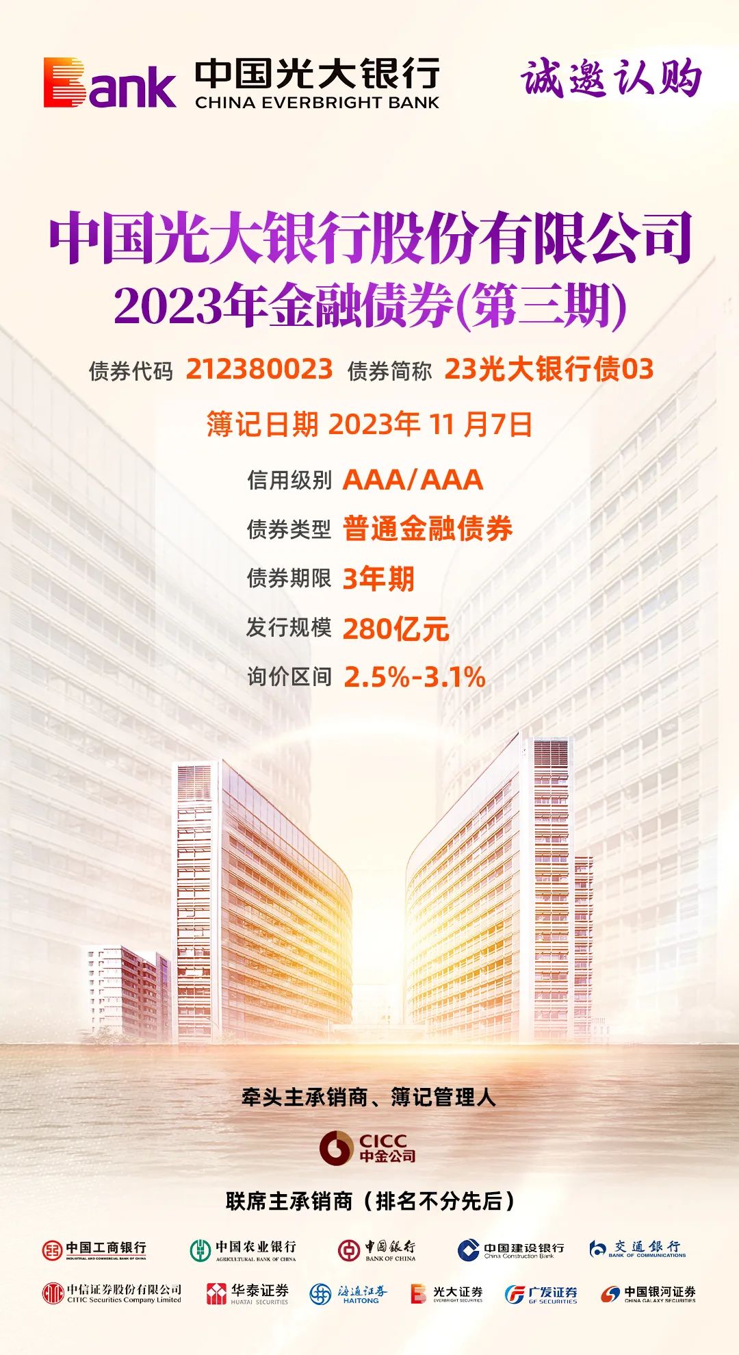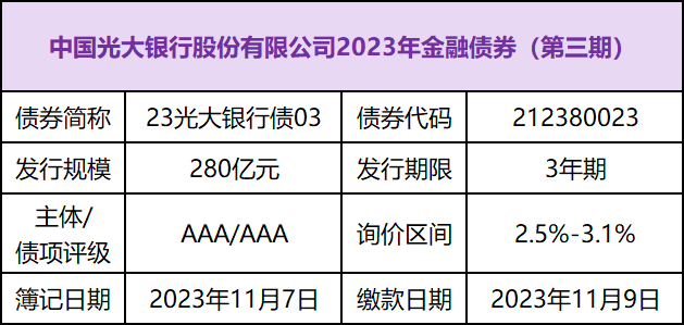 中国光大银行股份有限公司2023年金融债券(第三期)将于11月7日在全国银行间债券市场簿记发行。本期债券发行期限为3年期,发行规模为280亿元。本期债券的主体评级为AAA,债项评级为AAA,募集资金将用于优化发行人负债结构,充实营运资金,促进业务稳健发展。诚邀投资人认购询价!