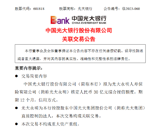 12月11日金融一线消息,光大银行发布关联交易公告。公告显示,中国光大银行股份有限公司拟为光大永明人寿保险有限公司核定人民币 30 亿元综合授信额度,期限12个月,信用方式。光大永明为该行控股股东中国光大集团股份公司直接控制的法人,本次交易构成关联交易。