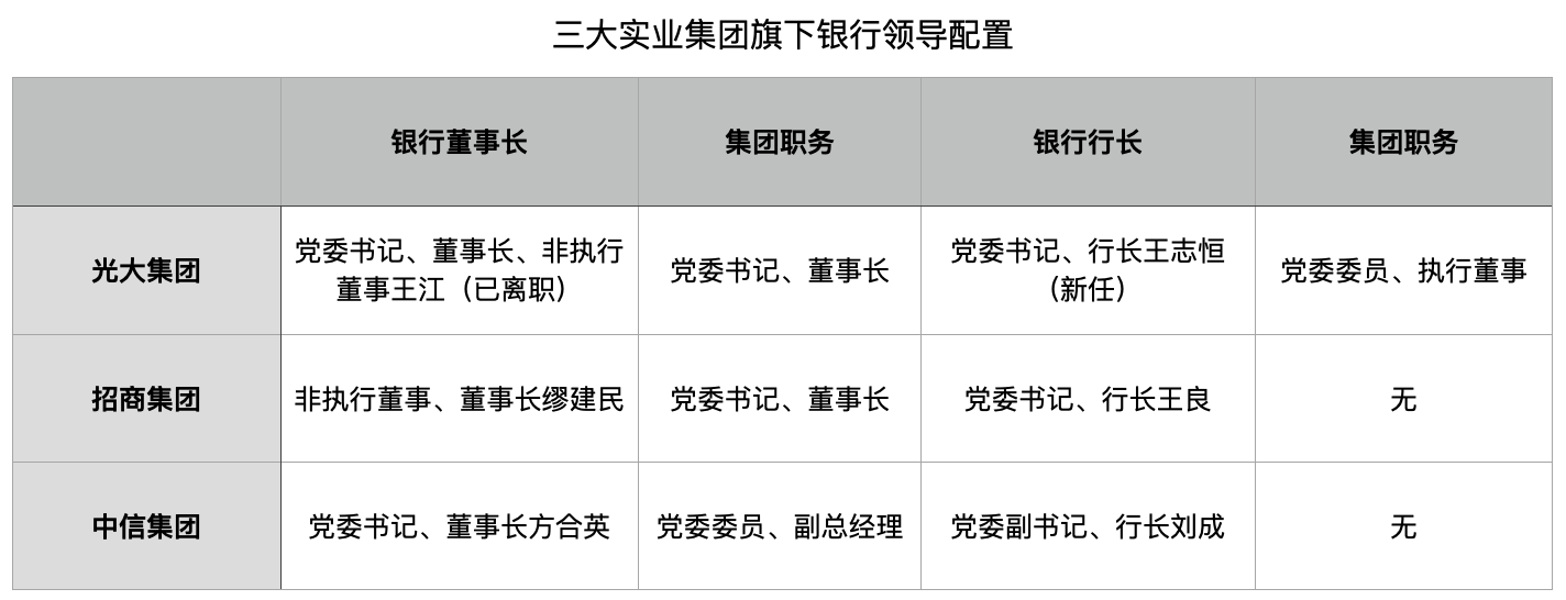 在我国,与光大集团的类似的,还有招商局集团、中信集团,后二者旗下分别有招商银行、中信银行。不过,梳理发现,三家集团在旗下银行董事长、行长的职务安排方面均不相同。