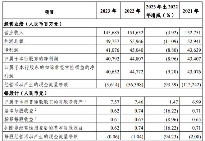 2023年,光大银行录得营收1456.85亿元,同比下降3.92%;净利润410.76亿元,同比下降8.80%。