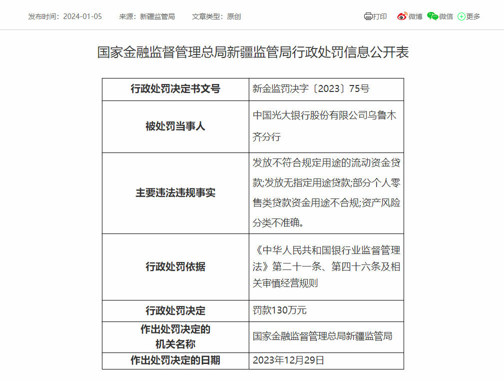 2023年12月29日,光大银行乌鲁木齐分行因“发放不符合规定用途的流动资金贷款;发放无指定用途贷款;部分个人零售类贷款资金用途不合规;资产风险分类不准确”,被罚款130万元。