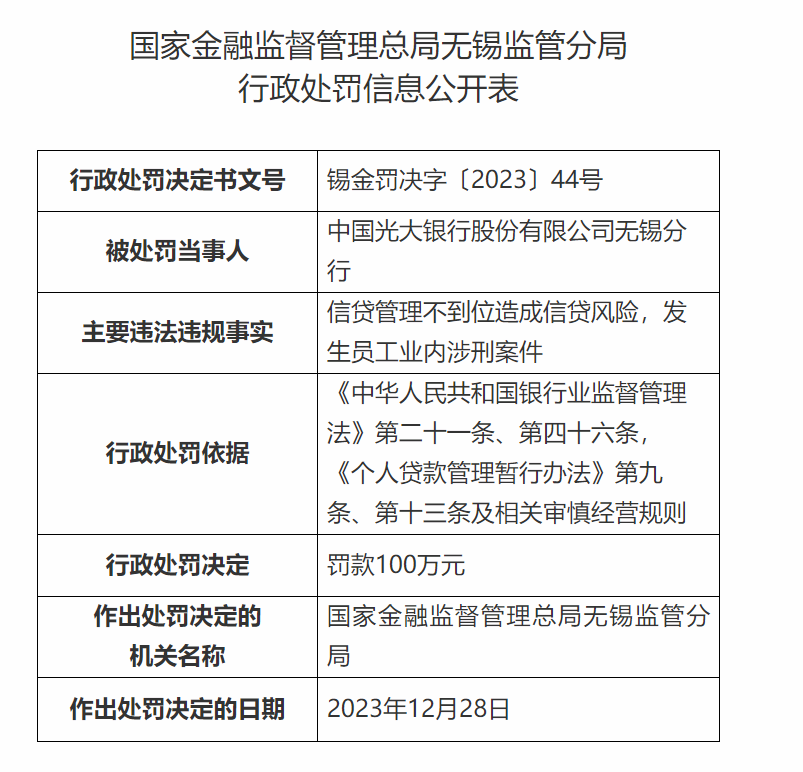 2023年12月28日,光大银行无锡分行因“信贷管理不到位造成信贷风险,发生员工业内涉刑案件”被国家金融监督管理总局无锡监管分局罚款100万元。