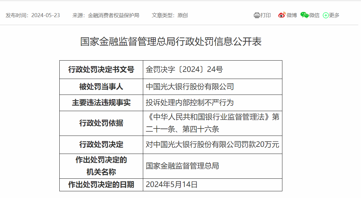 5月23日,国家金融监督管理总局网站发布行政处罚信息显示,中国光大银行股份有限公司(下称光大银行)因“投诉处理内部控制不严行为”,金融监管总局依据《银行业监督管理法》第二十一条、第四十六条规定,对罚款20万元,作出处罚决定的日期为5月14日。
