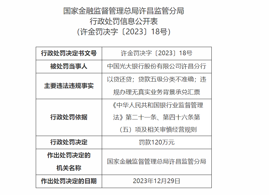 2023年12月29日,光大银行许昌分行因“以贷还贷;贷款五级分类不准确;违规办理无真实业务背景承兑汇票”,被罚款120万元。