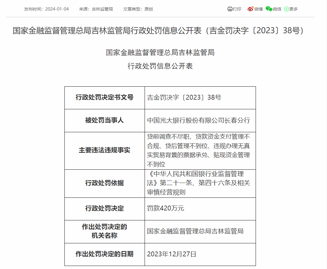2023年12月27日,光大银行长春分行因“贷前调查不尽职、贷款资金支付管理不合规、贷后管理不到位、违规办理无真实贸易背景的票据承兑、贴现资金管理不到位”,被国家金融监督管理总局吉林监管局罚款420万元,另有8人被警告。