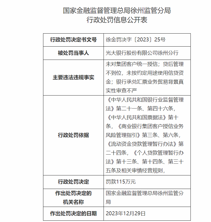 2023年12月29日,光大银行徐州分行因“未对集团客户统一授信;贷后管理不到位,未按约定用途使用信贷资金;银行承兑汇票业务贸易背景真实性审查不严”,被国家金融监督管理总局徐州监管分局罚款115万元。