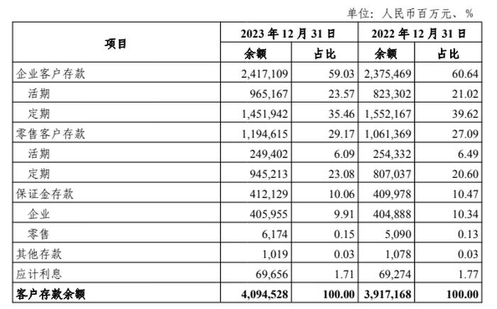 在负债端,2023年末,光大银行存款余额升至4.09万亿元,同比增长4.53%。这样的增速较2022年的6.57%放缓。