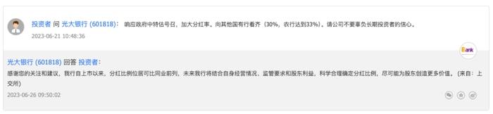 光大银行的回复为,自上市以来,该行分红率就处于可比同业前列,未来将继续科学确定分红比例,为股东创造价值。