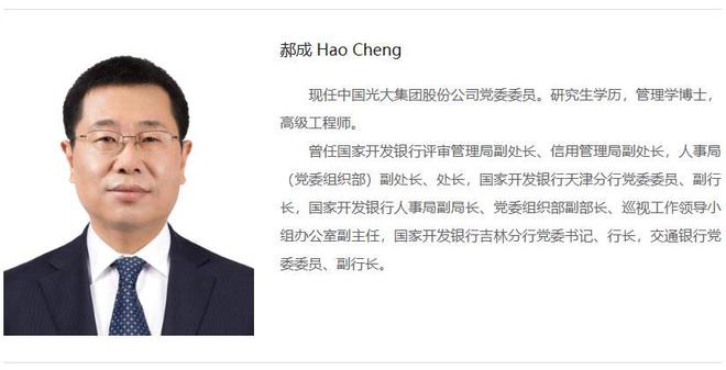 但交通银行郝成副行长转任光大集团的事却已证实。在光大集团网站的“集团领导”一栏中,郝成已赫然在列;“现任中国光大集团股份有限公司党委委员”,但暂无业务职务。