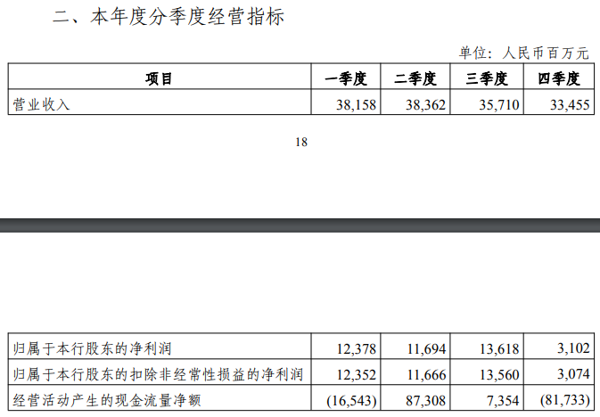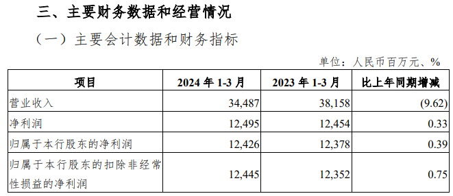 2024年一季度,实现净利润124.95亿元,比2023年同期增长0.33%。归属净利润124.26亿元,同比增长0.39%。