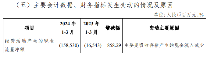 另外,如上图,2024年一季度,光大银行的经营活动产生的现金流量净额变化有点大。财报解释说,主要是吸收存款产生的现金流入减少。