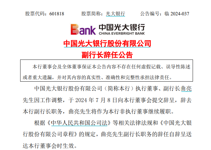 另据光大银行同日公告,该行执行董事、副行长曲亮因工作调整,于2024年7月8日向董事会提交辞呈,辞去副行长职务,曲亮将作为该行非执行董事继续履职。