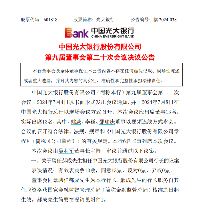 7月8日,光大银行发布第九届董事会第二十次会议决议公告称,董事会同意聘任郝成为该行行长,同意提名郝成为该行第九届董事会执行董事候选人,同意郝成担任第九届董事会社会责任、普惠金融发展和消费者权益保护委员会主任委员、委员,战略委员会委员,风险管理委员会委员。