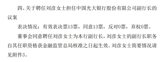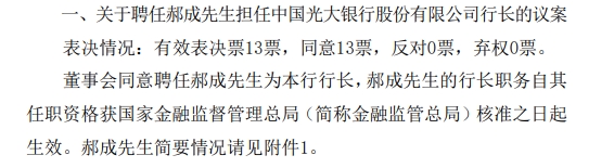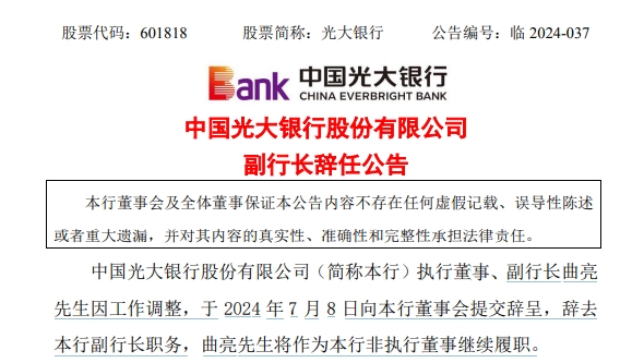 7月8日,光大银行发布公告宣布人事变动。其中,光大银行董事会同意聘任郝成担任该行行长,刘彦担任该行副行长。曲亮则因工作调整辞去该行副行长职务。