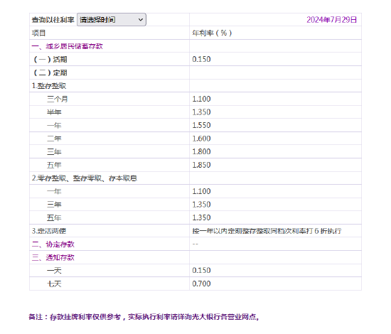 7月29日金融一线消息,光大银行宣布调整人民币储蓄存款执行利率,一年期、两年期、三年期和五年期人民币定期存款利率分别降至1.55%、1.60%、1.80%、1.85%。