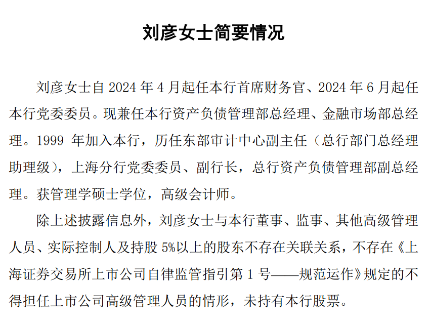 简历显示,刘彦,女,管理学硕士,高级会计师。刘彦自2024年4月起任光大银行首席财务官,2024年6月起任光大银行党委委员,兼任该行资产负债管理部总经理和金融市场部总经理。刘彦1999年加入光大银行,历任东部审计中心副主任(总行部门总经理助理级),上海分行党委委员、副行长,总行资产负债管理部副总经理。