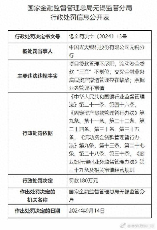 9月26日,国家金融监督管理总局无锡监管分局行政处罚信息公开表显示,中国光大银行股份有限公司无锡分行(下称光大银行无锡分行)于本月14日被罚款180万元,另有三名相关责任人被处罚。