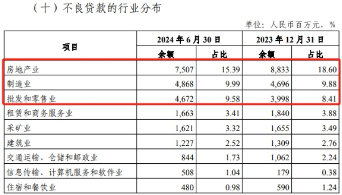 根据半年报中不良贷款的行业分布,该行不良贷款余额排名前三的分别是房地产业、制造业和批发和零售业,除了房地产不良贷款余额下降外,制造业和批发零售业的不良贷款余额和对应占比均有所提升。