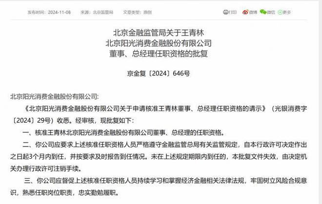 近日,北京金融监管局发文称,核准王青林北京阳光消费金融股份有限公司(以下简称“阳光消金”)董事、总经理的任职资格。