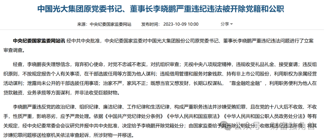 据中央纪委国家监委网站显示,2023年10月因李晓鹏既想当官又想发财,长期以权谋私,“靠金融吃金融”,利用职务便利为他人在贷款融资、业务承揽等方面谋利,并非法收受巨额财物等一系列违法违规行为被“双开”。