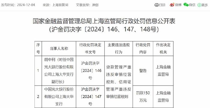 12月4日,光大银行上海大华支行因“贷款管理严重违反审慎经营规则、信用证管理严重违反审慎经营规则”,被国家金融监督管理总局上海监管局罚款150万元。