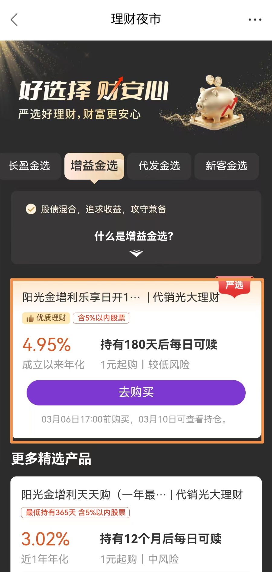 2月中旬以来债市出现一轮调整,不少理财产品出现净值下跌,那么还有哪些理财产品能保持高收益呢?理财通评评“理”持续测评银行热销理财产品,本期关注光大银行APP“理财夜市”增益金选榜排第一的产品:阳光金增利乐享日开1号(180天最低持有)A。成立以来年化收益率接近5%。