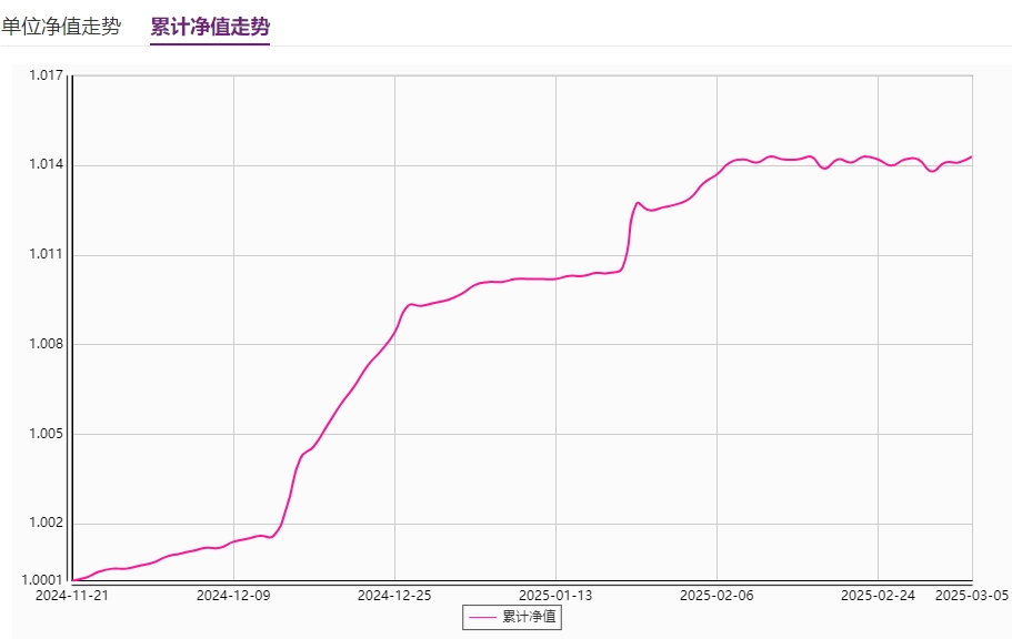 该产品成立于2024年11月21日,正好赶上了债市此后一轮上涨行情,该产品的净值在12月12日后出现了一波明显拉升。不过在今年2月10日后净值增长乏力,出现了小幅波动。可能跟债市出现调整有一定关系。因此近1个月年化收益率不高,只有1.2%。