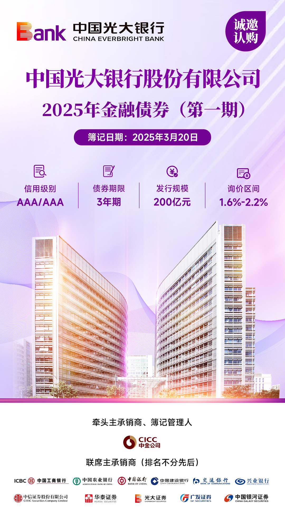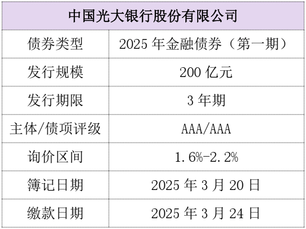 中国光大银行股份有限公司2025年金融债券(第一期)将于3月20日在全国银行间债券市场簿记发行。本期债券发行期限为3年期,发行规模为200亿元。本期债券发行人的主体评级为AAA,债项评级为AAA。本期债券募集资金将用于优化发行人负债结构,充实营运资金,促进业务稳健发展。