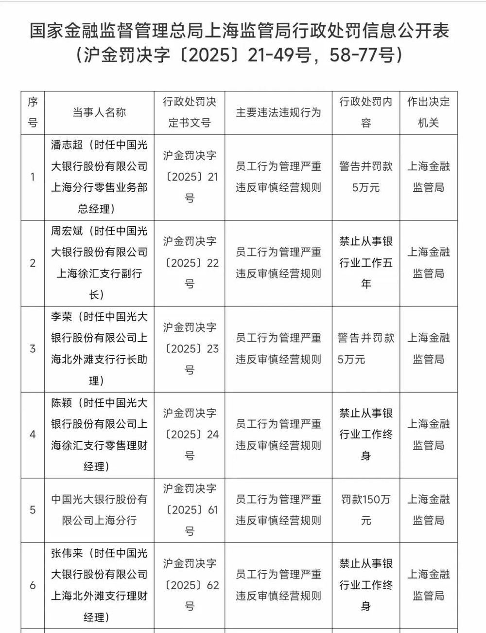 到了2月8日,国家金融监督管理总局上海监管局公布的行政处罚信息显示,中国光大银行股份有限公司上海分行因员工行为管理严重违反审慎经营规则,被罚款150万元。同时,多名高管因相关违规行为受到警告、罚款及终身禁业等处分。