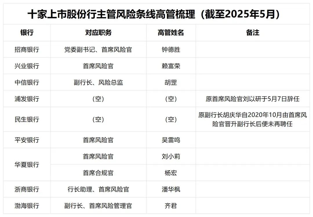 值得一提的是,浦发银行、民生银行当前风险管理管职务尚且空缺,其中浦发银行原副行长兼首席风险官刘以研刚于月初辞任;此外,另有两家银行所设职务名称有所不同——中信银行所设风险条线高管为风险总监,由副行长胡罡担任,而渤海银行所设风险条线高管为首席风险管理官,由副行长齐军兼任。同时,《行长速览》注意到,平安银行也略有不同,该司首席风险官不在官网所示高级管理人员队列当中。