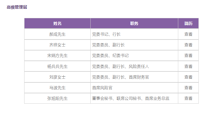 截至目前,光大银行高级管理层成员包括:董事长吴利军,党委书记、行长郝成,党委委员、副行长齐晔,党委委员、纪委书记宋炳方,党委委员、副行长、风险负责人杨兵兵,党委委员、副行长、首席财务官刘彦,首席风险官马波,董事会秘书、联席公司秘书、首席业务总监张旭阳。其中除行长郝成出身国开行、交行副行长任上跨界而来外,其他高管均擢升自光大银行体系内部。