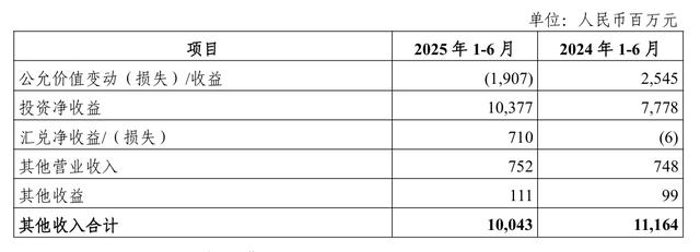 其他收入方面,光大银行也出现了下降。2025年上半年,光大银行的其他收入为100.43亿元,同比减少11.21亿元,下降了10.04%。主要原因就是公允价值变动从2024年上半年的收益25.45亿元,变成了2025年上半年损失19.07亿元。